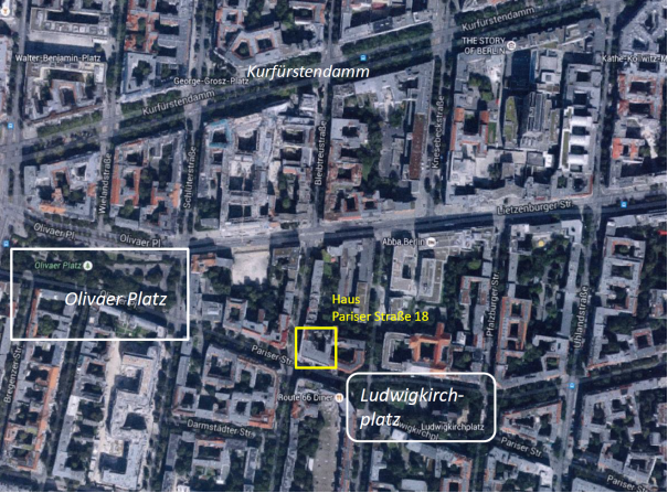 Das Eckhaus liegt an der Kreuzung von den zwei ruhigen innerstädtischen Wohnstraßen Pariser Straße und Sächsische Straße. Wer dem Großstadttrubel kurz entfliehen will, findet direkt vor der Haustüre den Ludwigkirchplatz sowie nur unweit entfernt den Olivaer Platz.